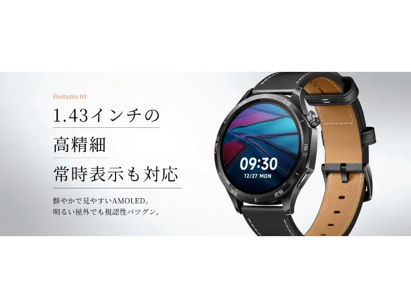ディスプレイは、円形の1.43インチ。最高級のAMOLED(有機EL)パネルを採用しています。